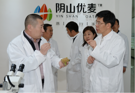 民豐種業董事長盧文兵對公司近年來的發展情況以及企業三產融合的實施布局情況向黃志強副主席進行了詳細的匯報。近幾年,民豐種業已發展成為中國集馬鈴薯、燕麥研發、種子生產、分級加工、物流倉儲、推廣銷售于一體的現代化農業企業,是農業產業化國家重點龍頭企業、國家高新技術企業、自治區扶貧龍頭企業。子公司陰山優麥已發展成為中國燕麥深加工企業,是自治區農業產業化重點龍頭企業和自治區扶貧龍頭企業,所生產的燕麥米、燕麥片、燕麥餐杯、燕麥高纖素等燕麥食品銷往全國二十多個省市,成為百姓餐桌上的大健康食品。子公司蒙薯食品“年產8000噸低溫油炸薯條、2000噸胡蘿卜脆片加工項目”也將于今年投產。